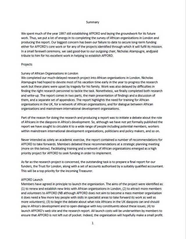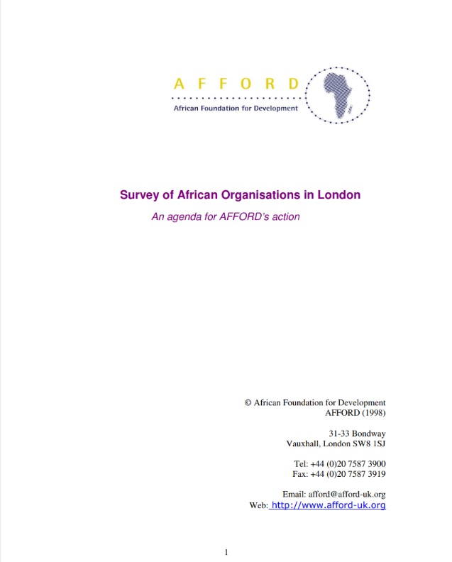 In 1997 AFFORD conducted a survey of African organisations in London, detailing the extent and scope of their, and their needs as a sector.